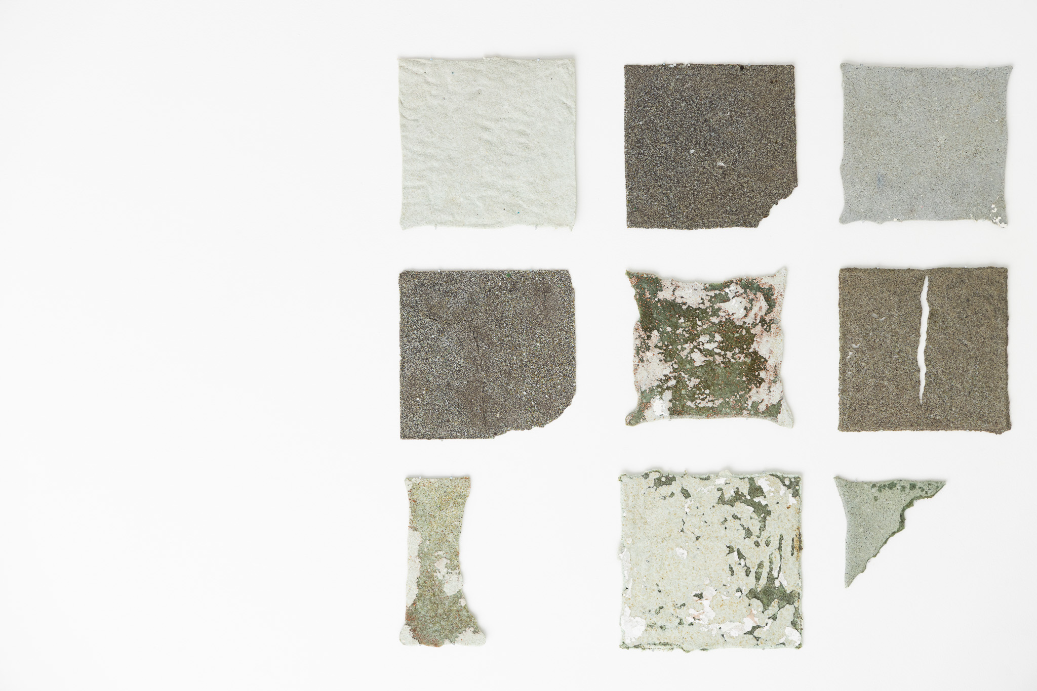 Emma Pinsent, fragments (15 panels), 2025, milled and fused glass cullet, rusted car bodies, local bricks, quartz sand, alumina, kiln wash. Dimensions variable (approx 23x22cm). Images Hannah Ross